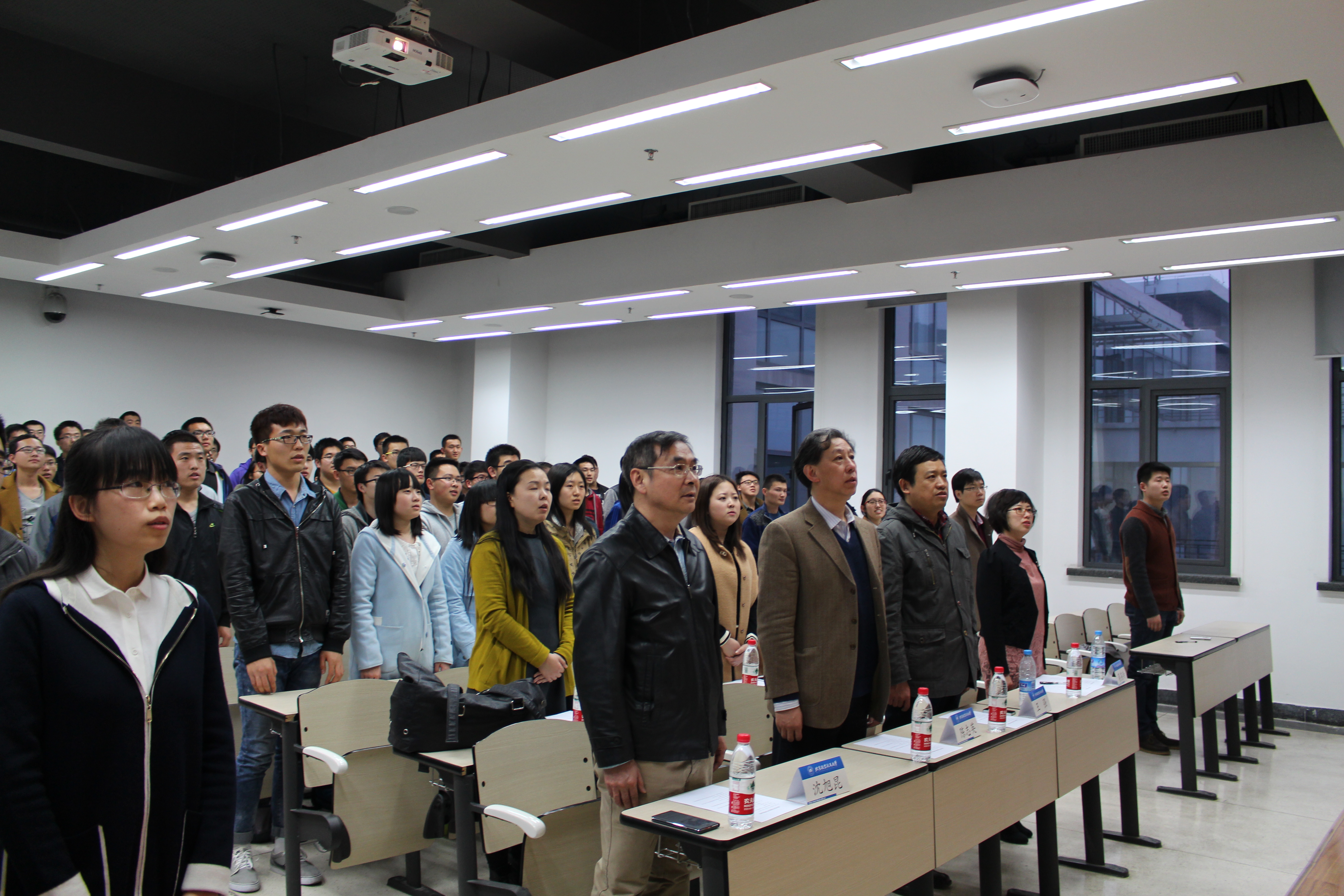 典礼开始后,全体起立唱国际歌,党校干部和学生在国际歌悠扬的歌声中,再一次感受到党的温暖与力量。紧接着,王强书记致辞并为第五期共建党校优秀学员颁奖。致辞中,王强书记解释了4、26、27三个系决定联合培养积极分子的原因。他说,希望能动的学生将来在自己的设计中增添一些艺术的因素,同时,随着环境问题逐渐进入人们的视野,发动机发展中的污染问题亟需27系的协助解决。26系和27系则希望在与4系的合作中,培养同学们的航空情怀。