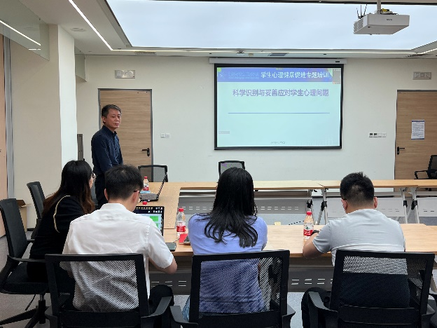 邀请了北航积极心理体验中心主任马喜亭教授作题为《科学识别与妥善应对学生心理问题》的专题培训。马喜亭从“谁可能有心理问题”、“学生心理危机信号”、“妥善应对危机学生”等三个方面分享了应对大学生心理问题的宝贵经验。他指出,精准感知是有效干预的基础和前提,学会如何识别心理危机信号是高校心理危机干预工作的重点。在后续的干预过程中,敏锐的觉察是成功沟通的必要条件,尊重差异是提高沟通效果的重要核心,“在关心呵护和暖心帮扶中开展教育引导”是根本保证。