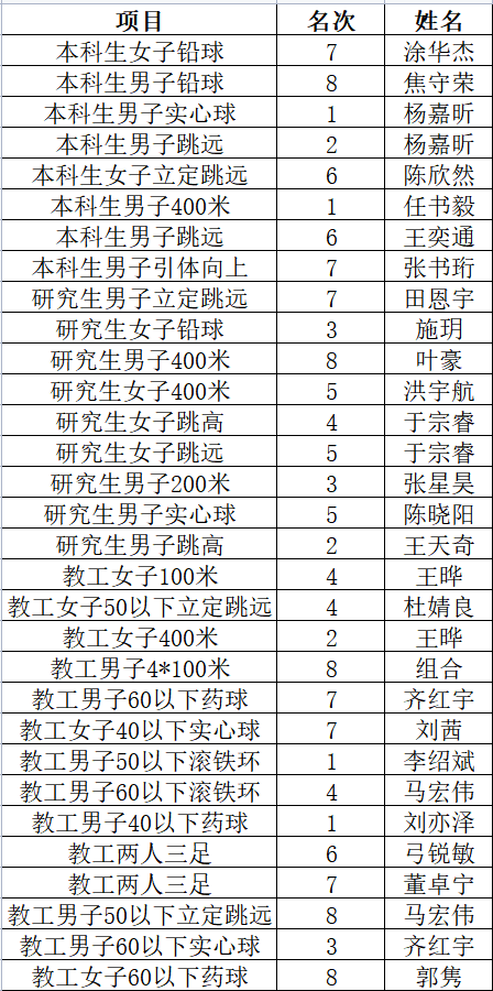赓续拼搏精神,铸就崭新辉煌,为期两天的运动会圆满闭幕,在动力师生的共同努力之下,运动员们取得优异成绩。多个项目斩获前8,四个项目位居第1,教职工获甲组团体第九名(共21支队伍),本科生获甲组团体第六名、研究生获甲组团体第五名(共25支队伍)、广播操获一等奖、永利娱乐城