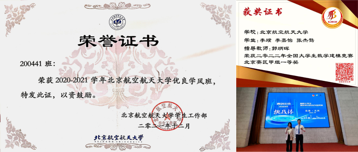 班级同学在校级及以上学科竞赛中获奖34人次,全国大学生数学竞赛北京市一等奖3人,“外教社词达人杯”全国一等奖1人,全国大学生数学建模竞赛一等奖1项。