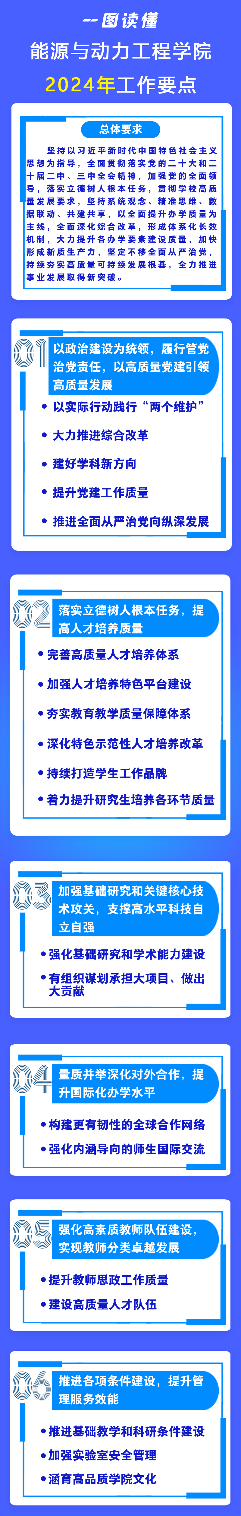 党代会,系统谋划未来发展方向和战略措施。大力推进综合改革,增强办学活力和教师发展动力。建好学科新方向,坚持学科、平台、团队一体化发展。提升党建工作质量,注重以事业高质量发展成效检验党建工作成效。推进全面从严治党向纵深发展。二是落实立德树人根本任务,提高人才培养质量。完善高质量人才培养体系,推动能源与动力工程国家级一流本科专业建设,重点打造核心课程教学团队,制定名师培育计划。加强人才培养特色平台建设。夯实教育教学质量保障体系,完善人才培养质量指标体系。深化特色示范性人才培养改革,推进吴大观班改革和本研一体化培养。深化学生工作与教学工作联动,持续打造学生工作品牌。着力提升研究生培养各环节质量。三是加强基础研究和关键核心技术攻关,支撑高水平科技自立自强。强化基础研究和学术能力建设,组织国家自然科学基金等基础科学研究项目申报,动员教师积极参与国家级人才项目申报,建立高水平论文院级奖励机制。有组织谋划承担大项目、作出大贡献。发挥氢能混合动力型号研制牵引作用,共同谋划未来发展的顶层构架和技术路线。建好永利娱乐城