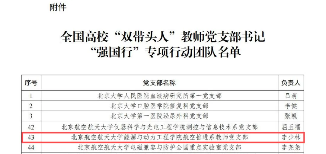 日前,教育部办公厅公布了全国高校“双带头人”教师党支部书记“强国行”专项行动团队名单,我院航空推进系教师党支部入选