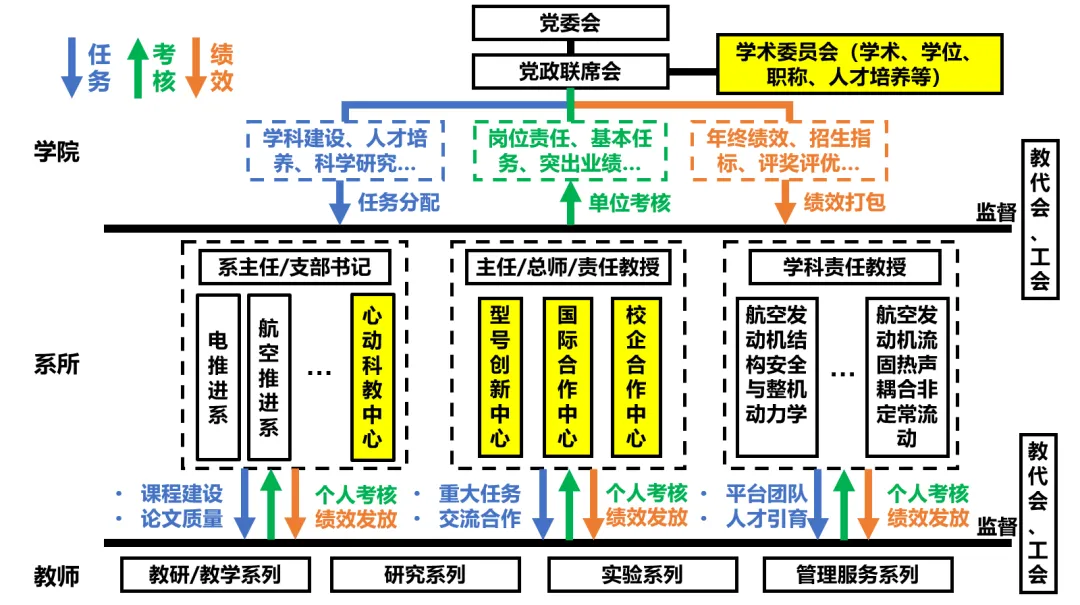综合改革,突出党建重引领、学科重交叉、科教重融合、治理重协同,横向打通要素,纵向压实责任,建立“任务-考核-绩效”强关联机制和内涵导向的资源配置机制。以重点问题和短板弱项为突破口,开展体制机制改革;以学科平台团队一体化建设为中心,统筹资源配置;以关键办学指标为牵引,细化落实各级岗位职责;以完成度和贡献度为标准,实施考核及薪酬绩效管理。建强基层教学组织,成立型号创新中心、校企合作中心、国际合作中心,调整学术委员会组成。与7类团队共46位团队负责人签订目标任务书。下放考核自主权,激发各系及学科方向教学科研活力。关键指标完成率达到87.5%。