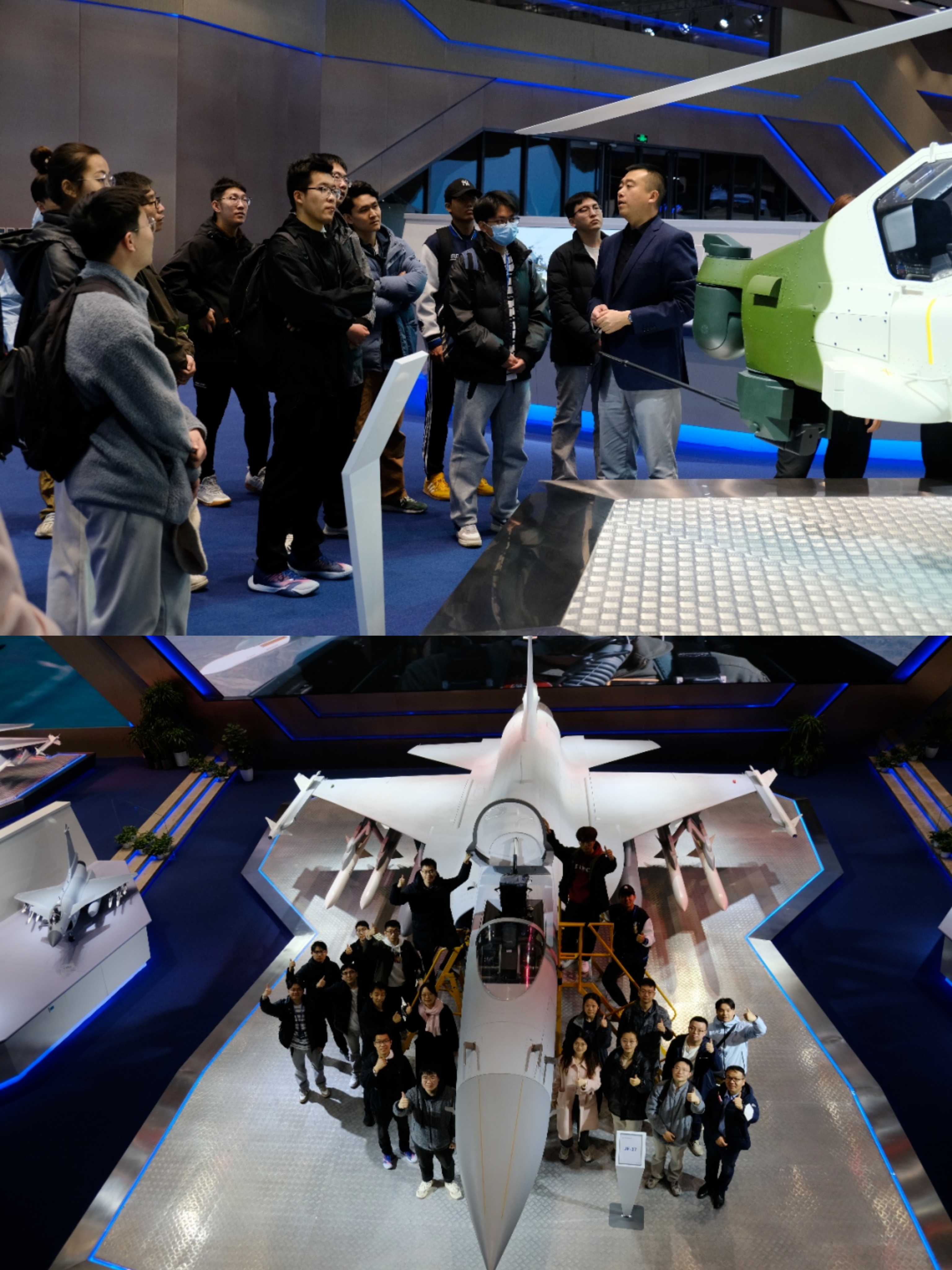 在中航技展厅区域,同学们参观了进出口贸易中的一些明星机型,这些展品系统展现了我国先进的装备技术。参观过程中,同学们通过模型展览、仿真驾驶模拟器等多种形式体验了展区内的各类机型。