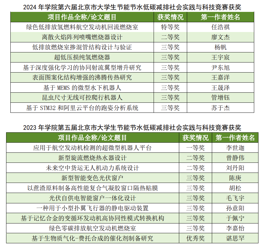 学子也屡创佳绩,2024年第六届北京市大学生节能节水低碳减排社会实践与科技竞赛竞赛中获特等奖一项、二等奖一项、三等奖七项,2023年第五届北京市大学生节能节水低碳减排社会实践与科技竞赛中获一等奖一项、二等奖三项、三等奖六项。