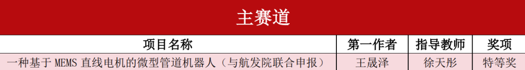 与航空发动机研究院联合申报并指导的项目《一种基于MEMS直线电机的微型管道机器人》斩获主体赛特等奖。