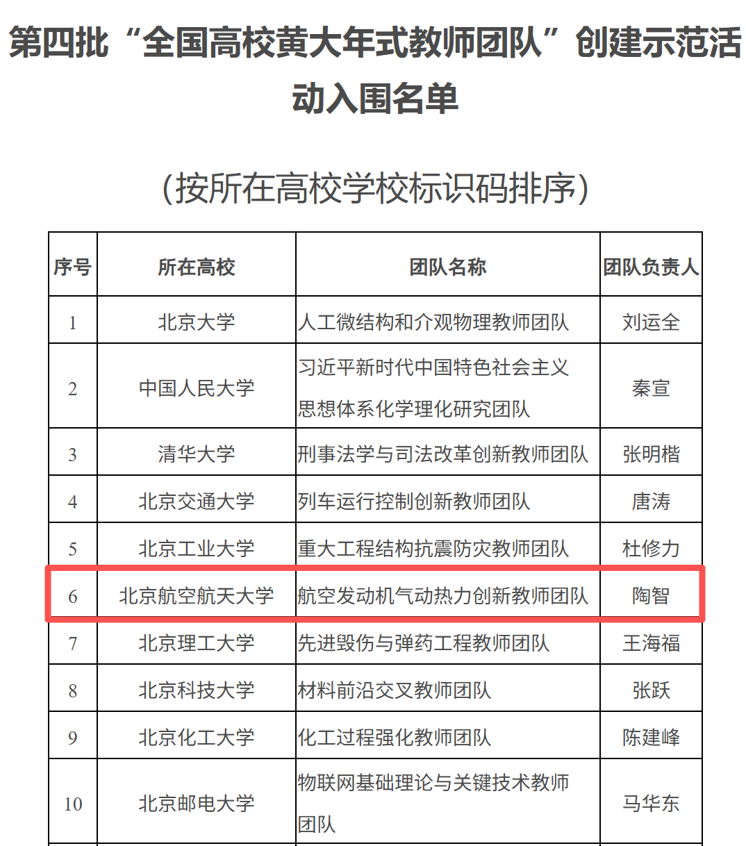 陶智院士领衔的航空发动机气动热力创新教师团队入选。