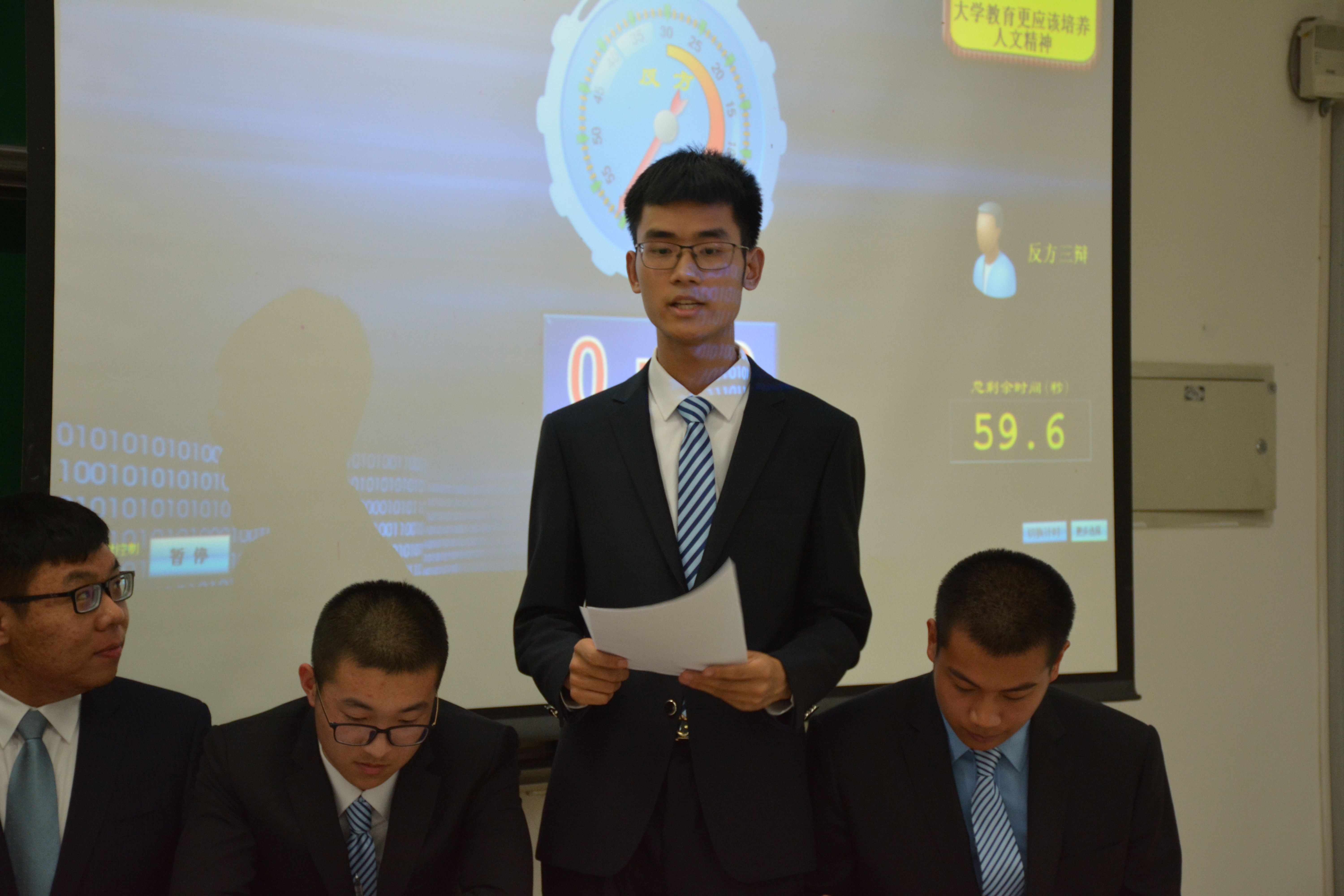 在首先进行的第一场比赛中,由正方“聪明可爱皮皮队”对战反方“言值附身队”,双方就“大学教育更应该培养科学精神还是人文精神”这一题目展开激烈辩论。最终,反方“言值附身队”获得本场比赛的胜利,正方二辩梁祎伦获“最佳辩手”称号。
