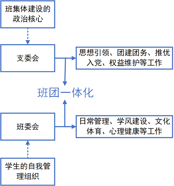 支委会由5名团干部组成,为方便活动开展,支部下分五个团小组,各小组分配有预备党员或发展对象作为平时活动的组织者、带头者,充分发挥党员的模范先锋作用。同时支委会与班委会协同工作,实现班团一体化。