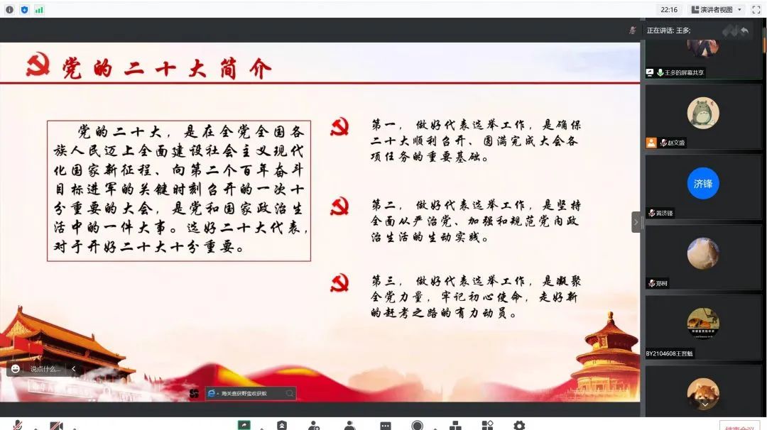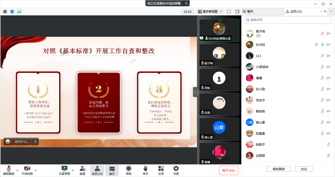 研究生SY21044等党支部通过学习《北京普通高等学校党建和思想政治工作基本标准》,对照开展支部工作自查和整改,通过对上学期党建工作的回顾,总结不足,各支部成员提出改进措施,保证每一次支部活动高质量的开展,并努力做好积极分子和预备党员的培养考察工作,针对各类问题支部成员在会议上积极献策,踊跃发言。