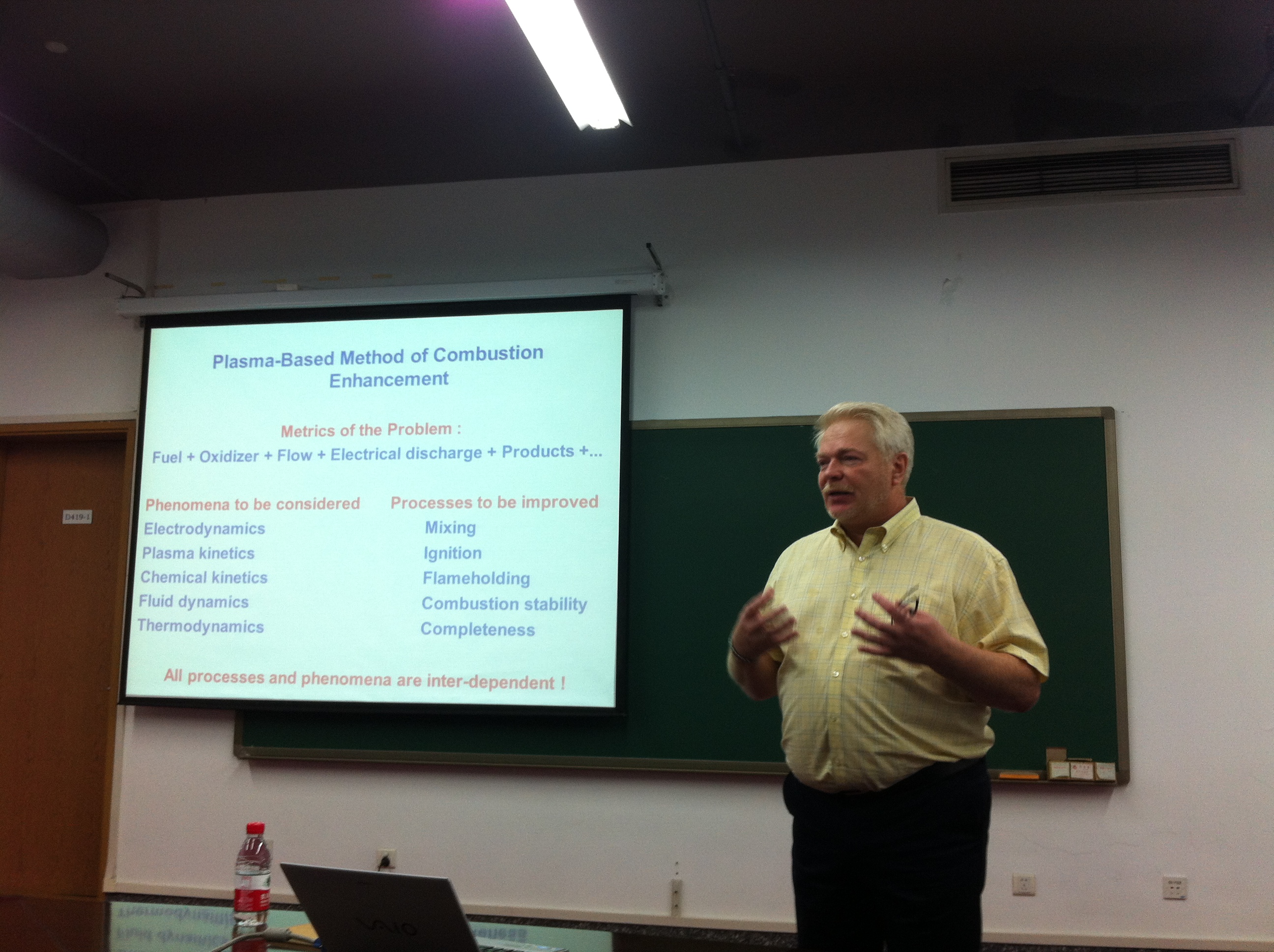 Sergey Leonov教授的讲座从超燃冲压发动机燃烧室的工程实际需求出发,依据等离子体强化掺混和强化燃烧的基础理论,将高能等离子体应用于超燃冲压发动机燃烧室,实现了两倍音速条件下的点火;并应用先进测量技术,以纳秒尺度为时间单位,探明了该条件下等离子体强化燃烧的内在机理。同时也简要介绍了激光定向传导等离子体的研究,展示了采用飞秒激光成功引导等离子体的线性传播结果。报告内容紧密结合航空航天工程实际,讲解过程深入浅出。讲座之后,与会师生与Sergey Leonov教授进行了热烈的讨论和交流。