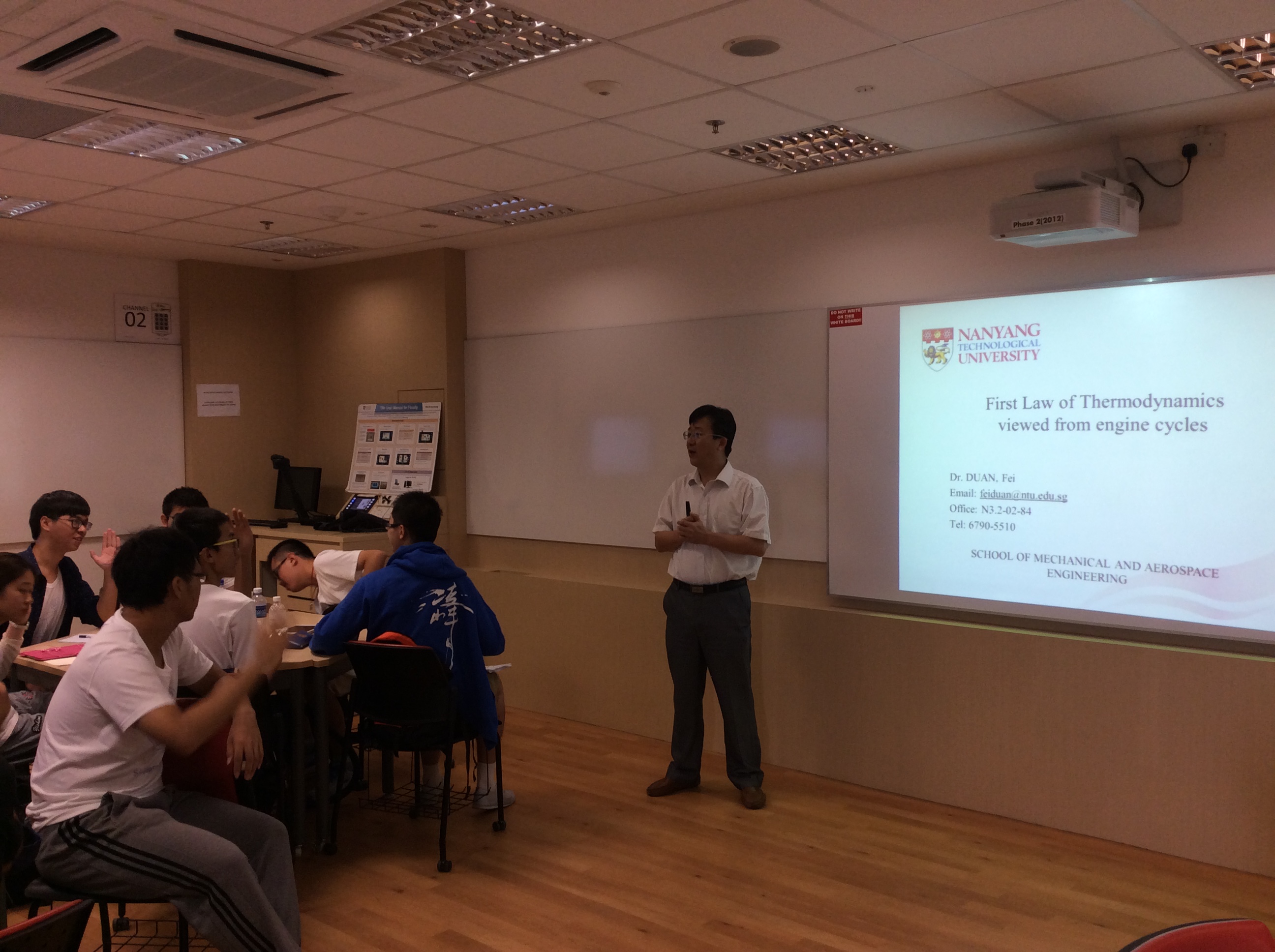 资深教师Duan Fei教授主讲的工程热力学课。经过一周的课程学习,同学们初步接受了航空行业相关的专业基础课程,切身体验了以南洋理工大学为代表的当今世界一流大学的课堂教学风格。这些都拓宽了同学们的视野,增长了同学们的认知能力。