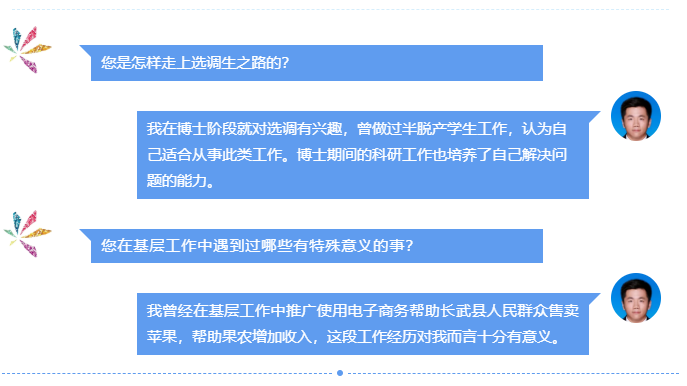 高度重视选调生工作,鼓励和支持学生在更广阔的平台上干事创业、服务社会,希望通过举办选调生系列经验交流会,搭建选调生校友与在校生之间的沟通桥梁,为学生就业和成长提供指导。