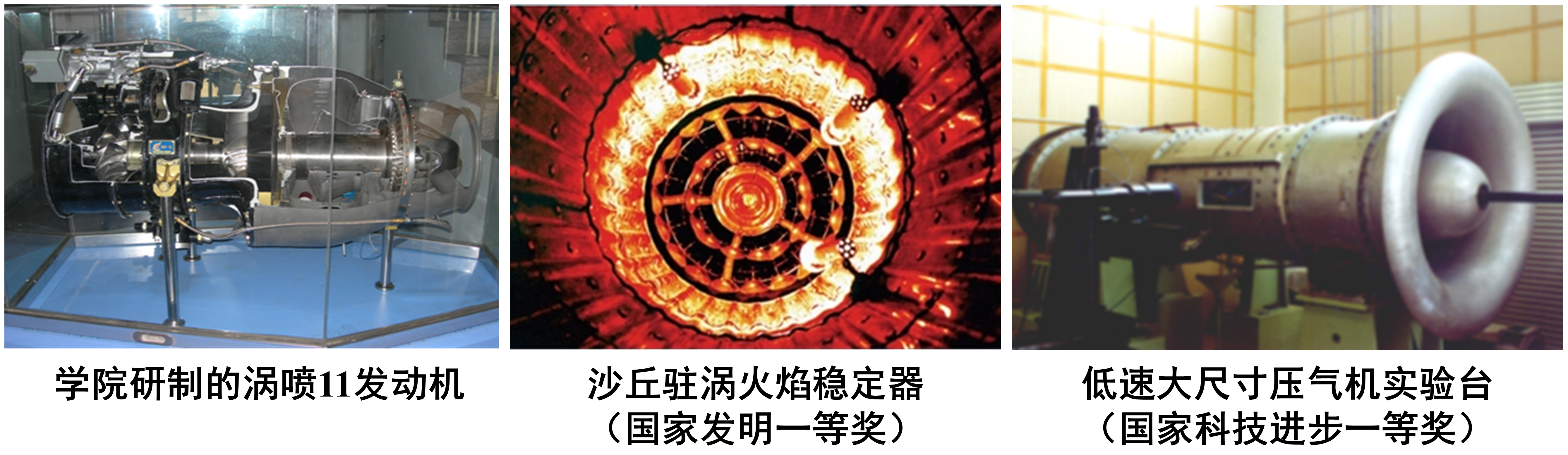 诞生了全球唯一由高校研制并量产的航空发动机—涡喷11发动机,发射了亚洲第一枚探空火箭,获得了国家发明一等奖“航空发动机沙丘驻涡火焰稳定器(被钱学森称为“一项为中国人争气的、很有价值的重要发明”)”、国家科技进步一等奖“低速大尺寸压气机实验台及动态测量技术”等12项国家级科技奖励。